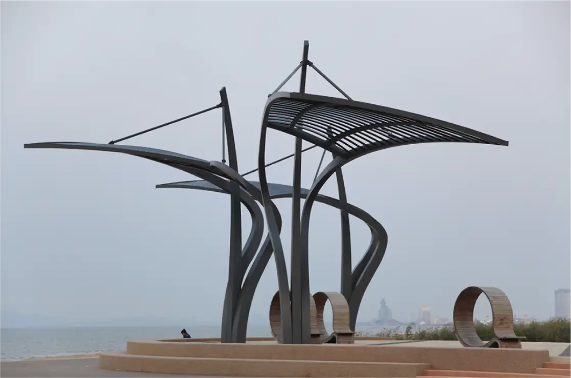 At the heart of the design lay the Dune Wind Sculptures—kinetic installations with rotating 316L stainless steel blades. By day, they mimicked desert dunes; by night, integrated LED strips cast dynamic shadows, evoking waves under starlight. Nearby, the Breakthrough Sculptures rose as angular sentinels, their 30°slope cut optimizing light refraction to reveal hidden chromatic layers beneath silver gray fluorocarbon finishes.